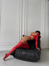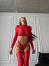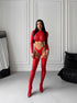 У комплект входить: топ з кісточками для підтримки форми, трусики з високою посадкою, панчохи червоні
